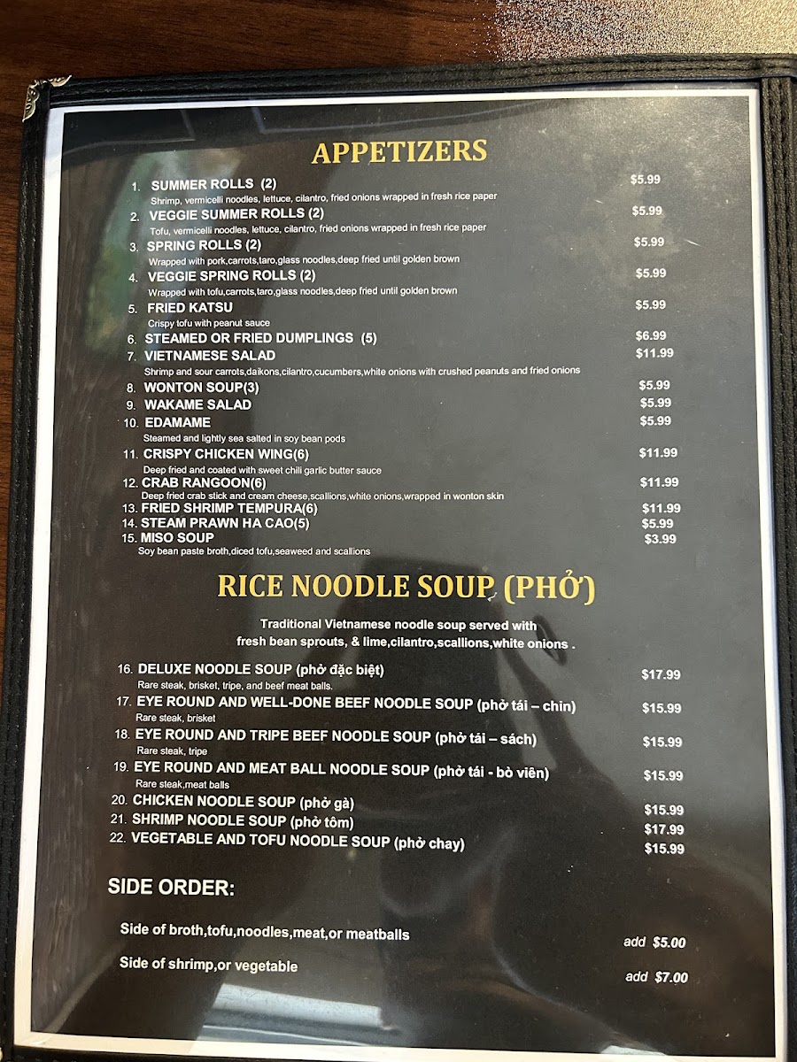 One of the standout choices is the Pho, featuring tender beef, shrimp, or chicken, each simmered to perfection. The Rice Vermicelli options are equally tantalizing, particularly the grilled shrimp and chicken with spring rolls — both generously portioned and packed with vibrant flavors.